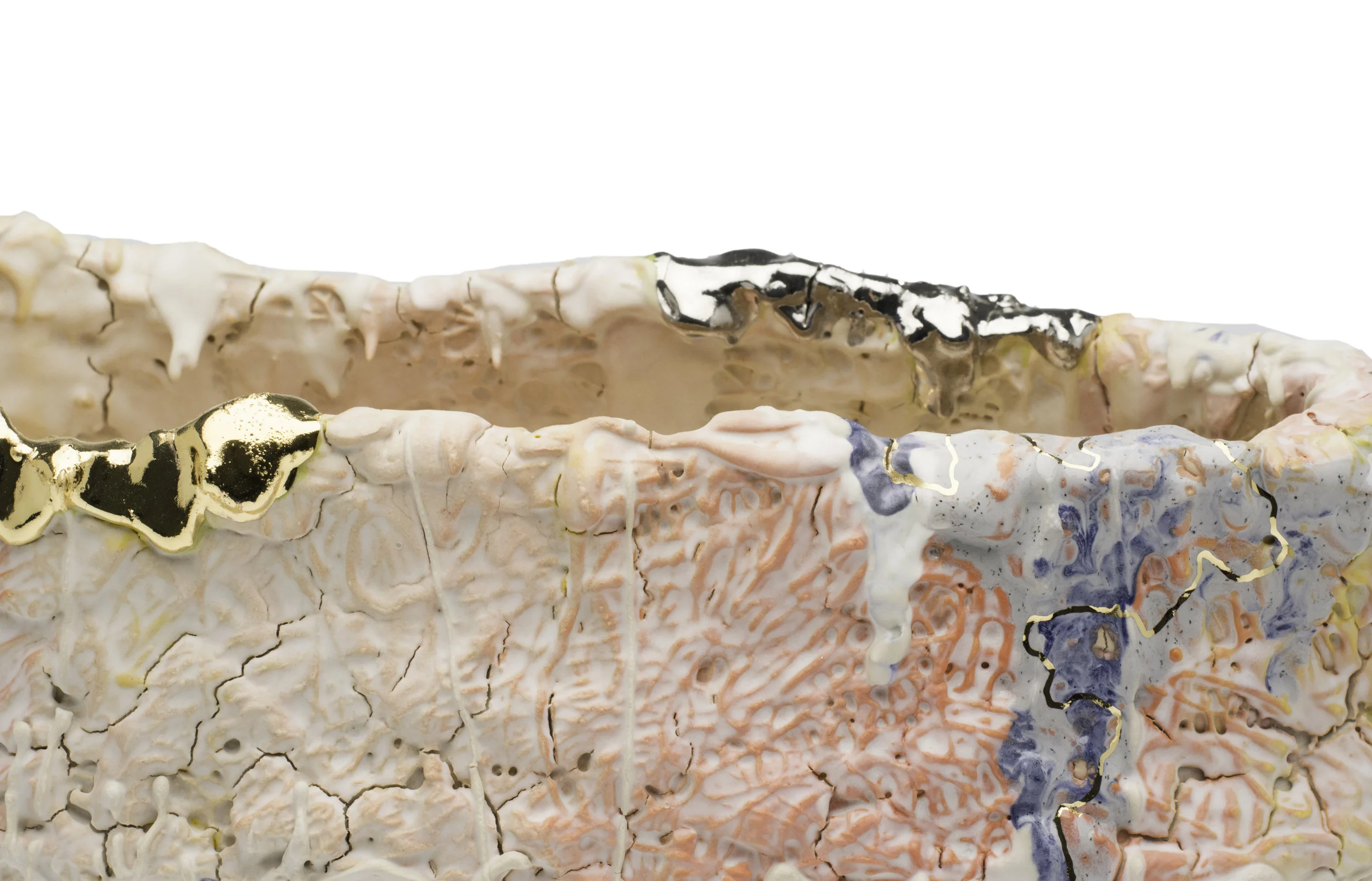 “Andrew Casto’s, Assemblage 110, is an intelligent blend of humor and refined craftsmanship. The organic and somewhat unrefined shapes suggest a less graceful take on the traditional medium ceramics which is renowned for craft and refinement and works to expand the possibility of what the medium is capable of. The hints of gold and candy colored glazing remind us of a remnant one might find in the excavation of a world envisioned by Takashi Murakami.”